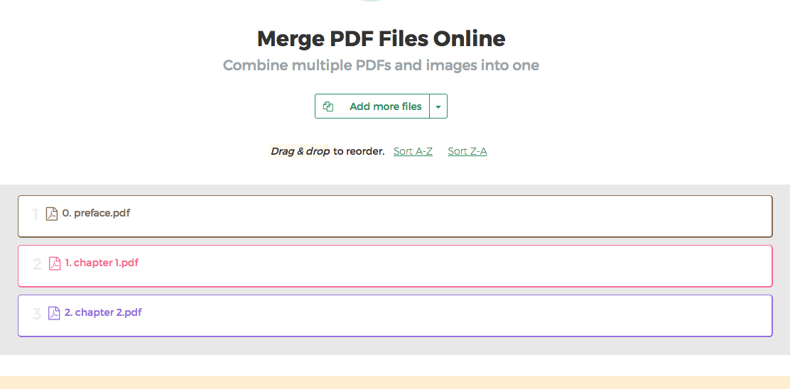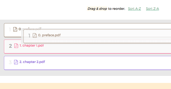 Déplacer et déposer les fichiers pour changer et combiner les ordres. Utiliser les boutons de triage pour trier alphabétiquement les noms de fichiers de 'A-Z' ou de 'Z-A'